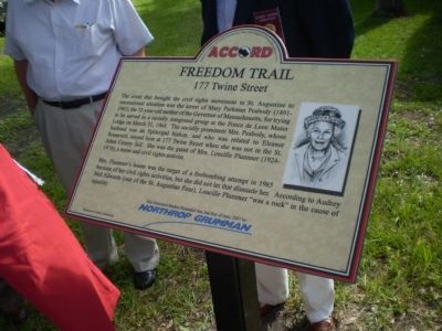 The socially prominent Mrs. Peabody, whose husband was an Episcopal bishop, and who was related to Eleanor Roosevelt, stayed here at 177 Twine Street when she was not in the St. Johns County Jail. She was the guest of Mrs. Loucille Plummer (1924-1978) a nurse and civil rights activist. Mrs. Plummer's house was the target of a firebombing attempt in 1965 because of her civil rights activities, but she did not let that dissuade her. According to Audrey Nell Edwards (one of the St. Augustine Four), Loucille Plummer "was a rock" in the cause of equality.